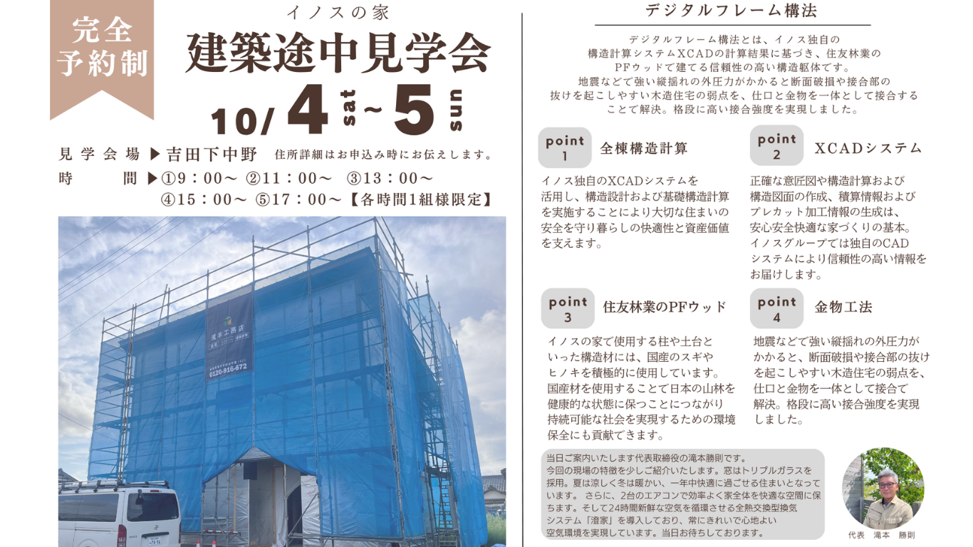 イベント&ニュースEVENT INFORMATION&NEWS 防災オンラインセミナーのご案内 10/18㈯開催 開催期間 10/18(土) 開催時間 10:00~12:00 場所 オンラインセミナーですので、ご自宅で視聴していただきます。 内容 10/18(土)10:00~12:00まで 無料オンラインセミナーがあります。 10/4・10/5 滝本工務店 建築途中見学会【終了しました】 開催期間 10/4・10/5 開催時間 ①9:00~10:00 ②11:00~12:00 ③13:00~14:00 ④15:00~16:00 ➄17:00~18:00 場所 燕市吉田下中野 (詳しい住所は申込後に) 10月のPLUSTEN営業日のお知らせ 開催期間 ショールーム見学はご予約お願いします。 開催時間 9:00-17:00 場所 PLUSTEN【有限会社滝本工務店事務所向かい】 内容 ショールーム見学はご予約お願いします。 PLUSTEN ショールーム見学会開催(燕市) 開催期間 ご希望の日時で調整いたします。 開催時間 予約制です。 場所 PLUSTEN【有限会社滝本工務店事務所向かい】 内容 PLUSTEN ショールーム見学会 イベント&ニュース一覧